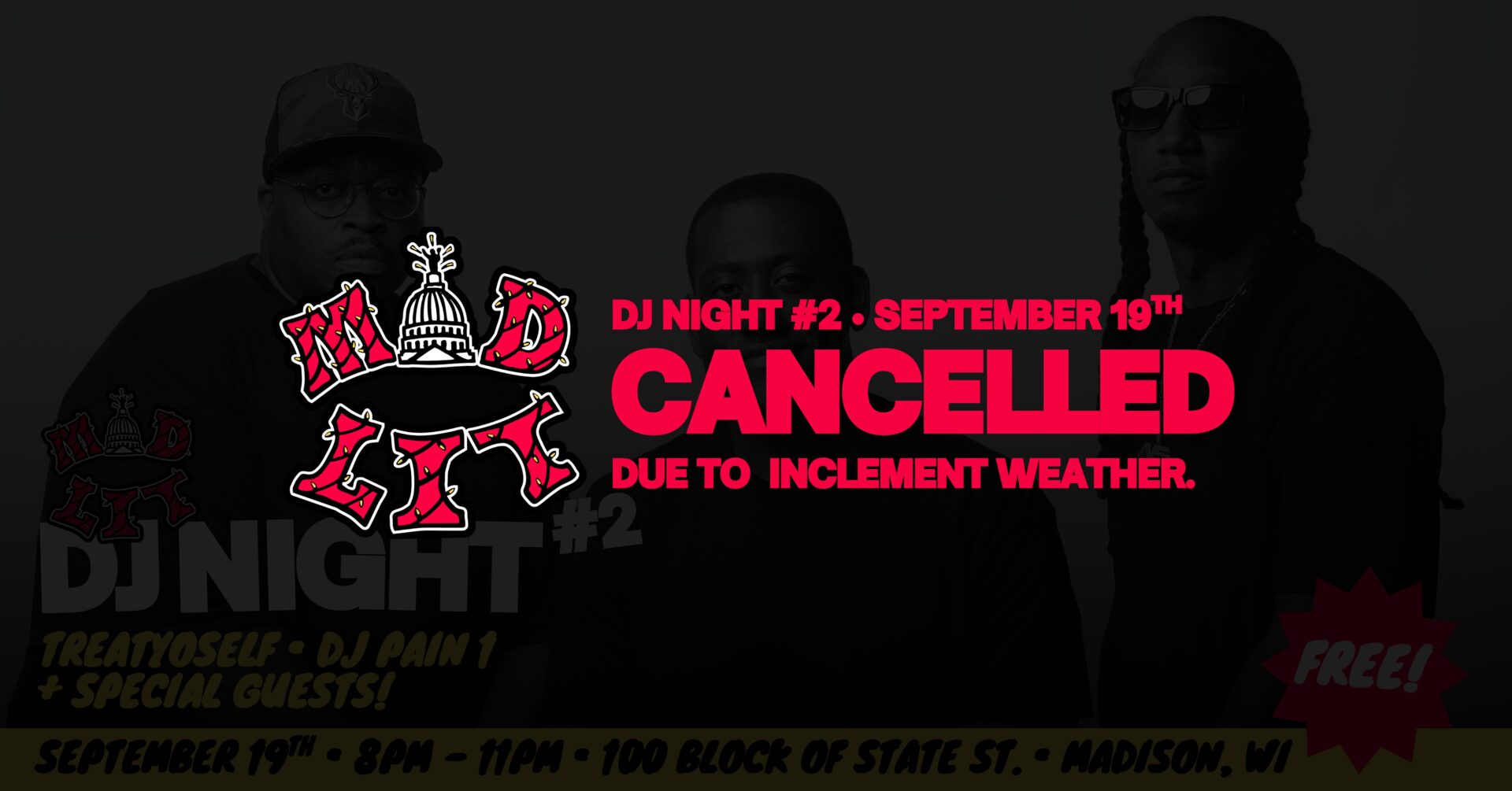 DJ Night #2, scheduled for September 19th, has been cancelled due to inclement weather.